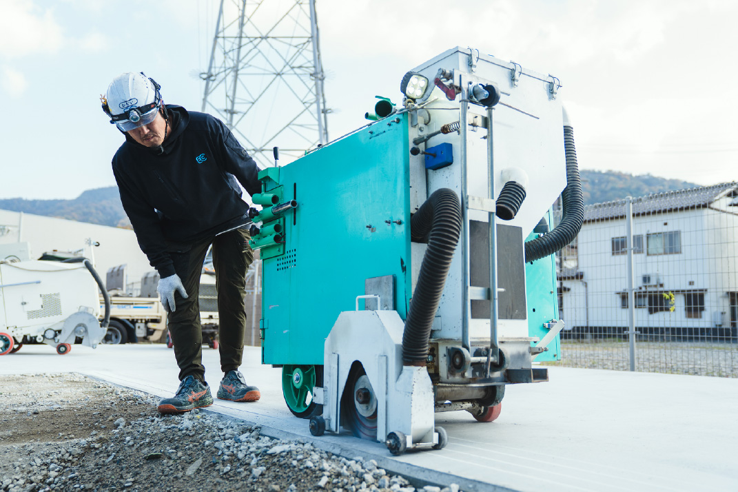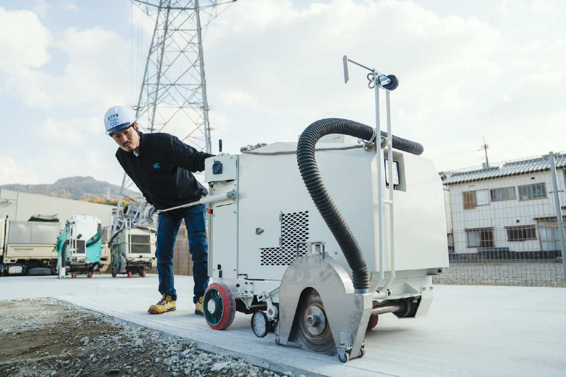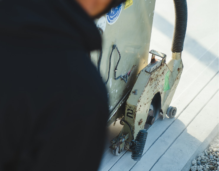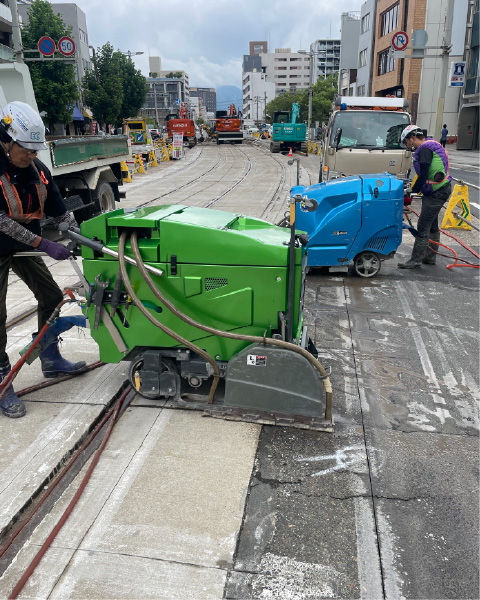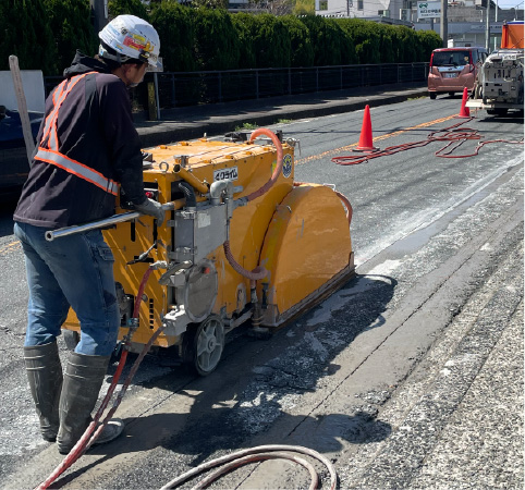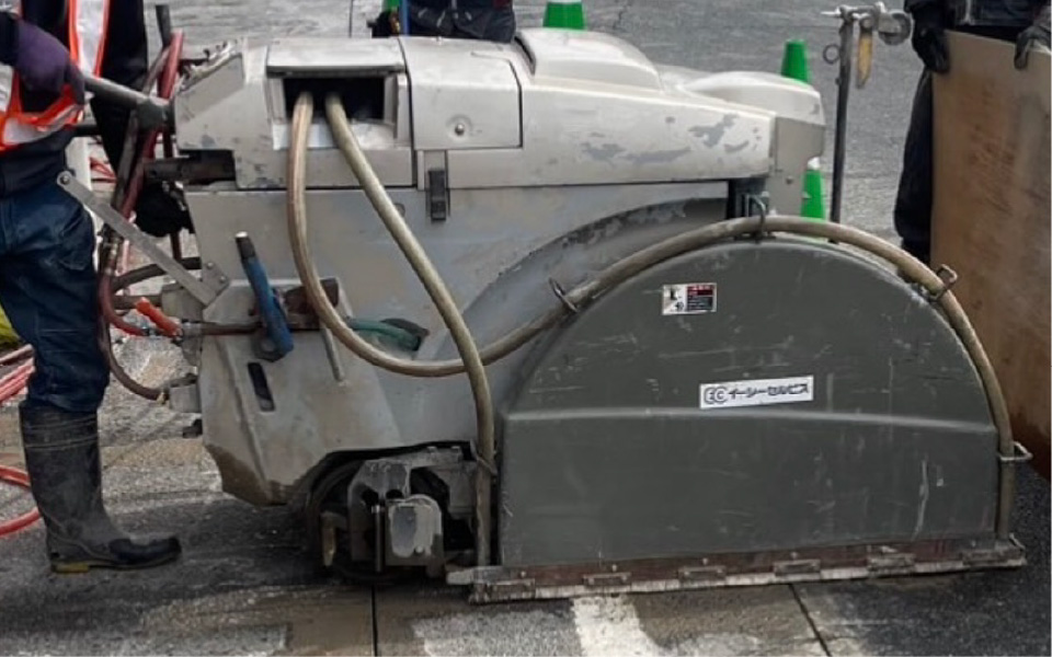 舗装道路の修繕や上下水道・電気・ガス・通信共同溝などの埋設工事及び地下鉄工事など初期工事として、舗装を切断します。また、高速道路や空港滑走路でのスリップ止め(グルービング)や融雪排水溝切り工事も行います。