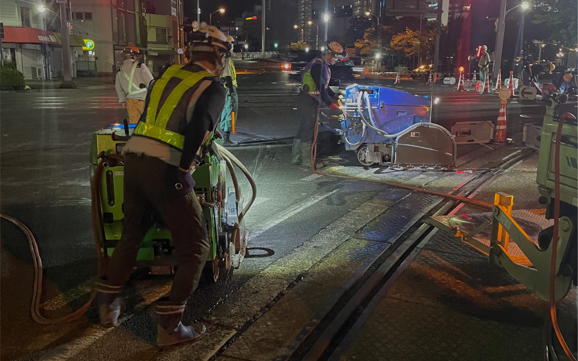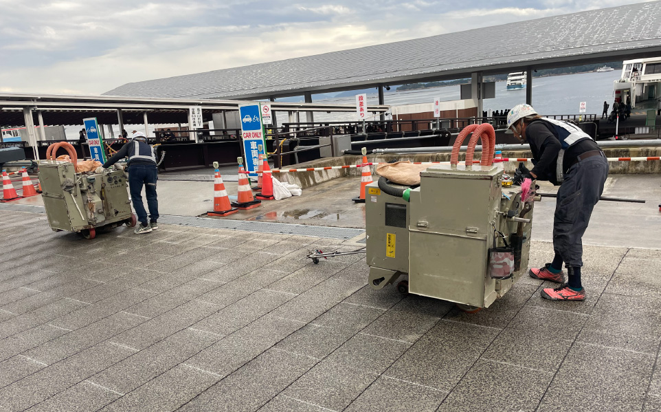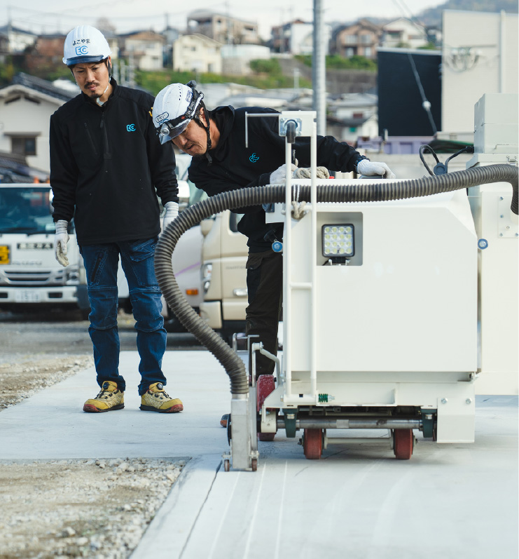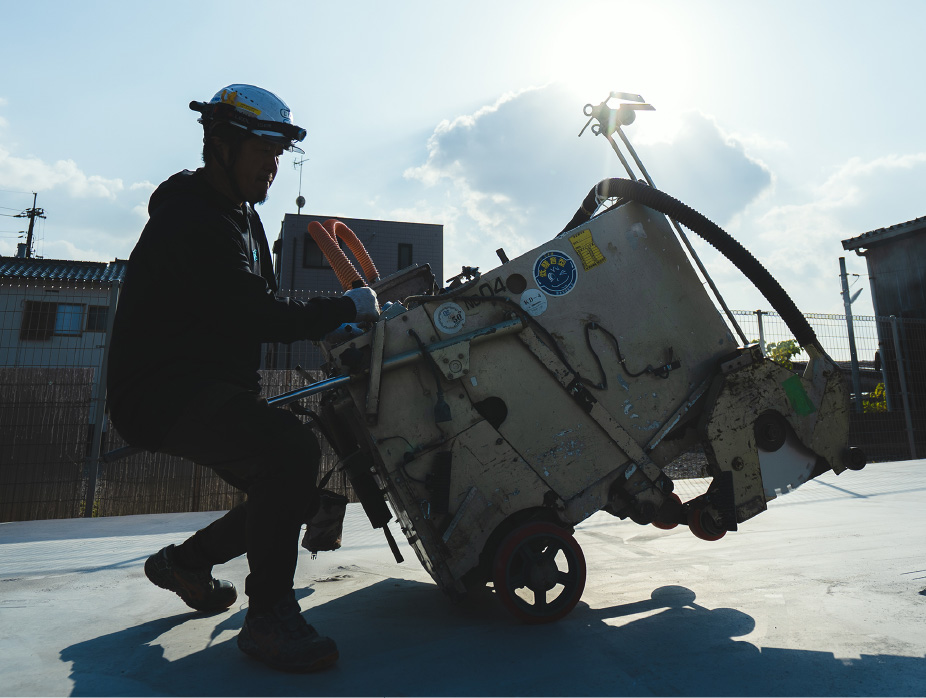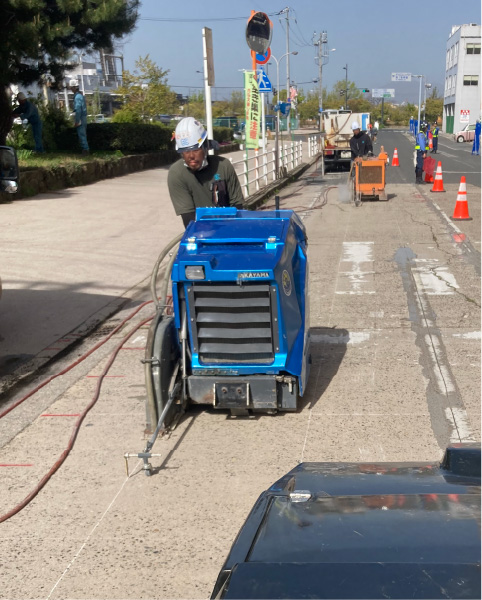 舗装道路の修繕や上下水道・電気・ガス・通信共同溝などの埋設工事及び地下鉄工事など初期工事として、舗装を切断します。また、高速道路や空港滑走路でのスリップ止め(グルービング)や融雪排水溝切り工事も行います。