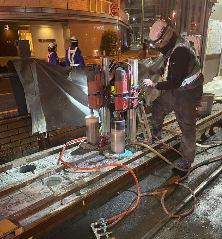 ブレーカーによるハツリなどの従来⼯法と⽐較して穿孔精度にすぐれ騒⾳・振動・粉塵が少ない⼯法です。