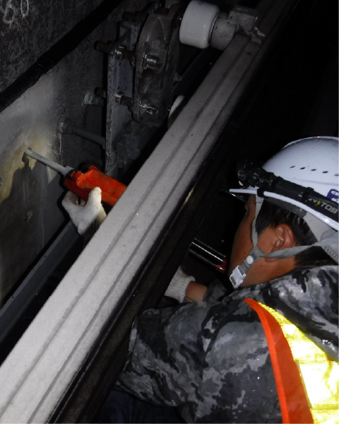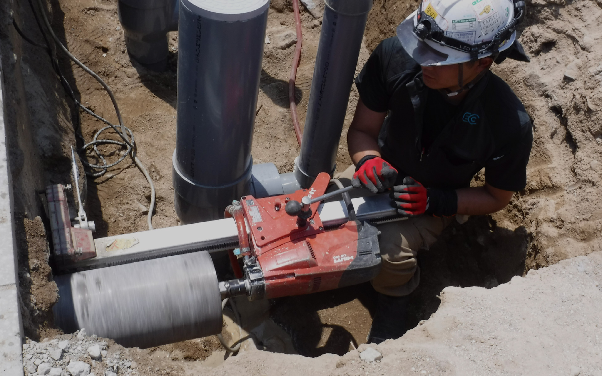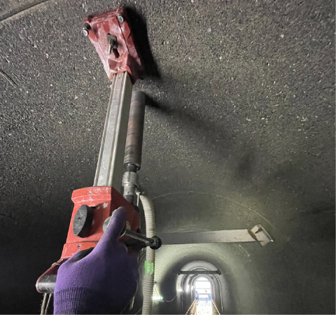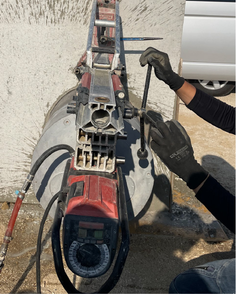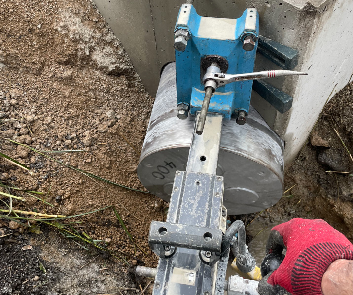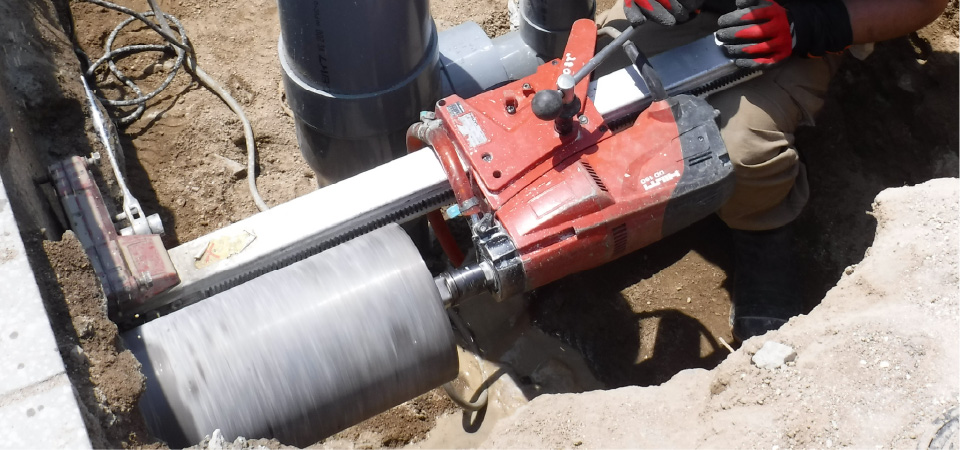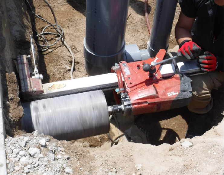 ダイヤモンドチップを円筒の先端に取り付け、円筒を⾼速回転させながら、ビル・橋・⼆次製品等のコンクリート構造物・道路を穿孔します。