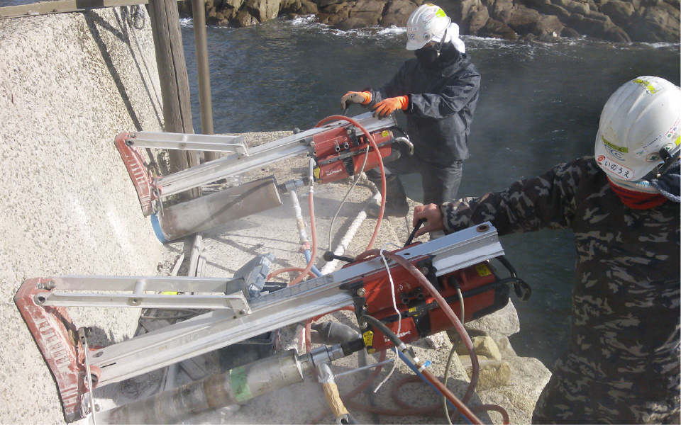 刃先にダイヤモンド砥粒を埋め込んだ筒状のダイヤモンドビットを高速回転させて、コンクリートの穿孔を行う技術。口径のバリエーションが豊富で、ラインカットによる部分切断も可能。スピーディかつ高精度で、解体・改修工事の現場で幅広く活躍します。