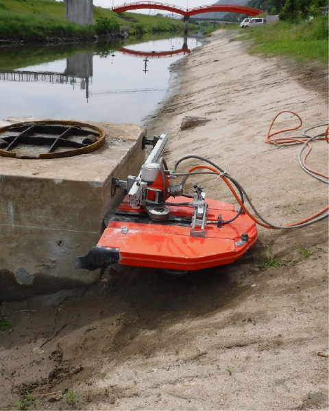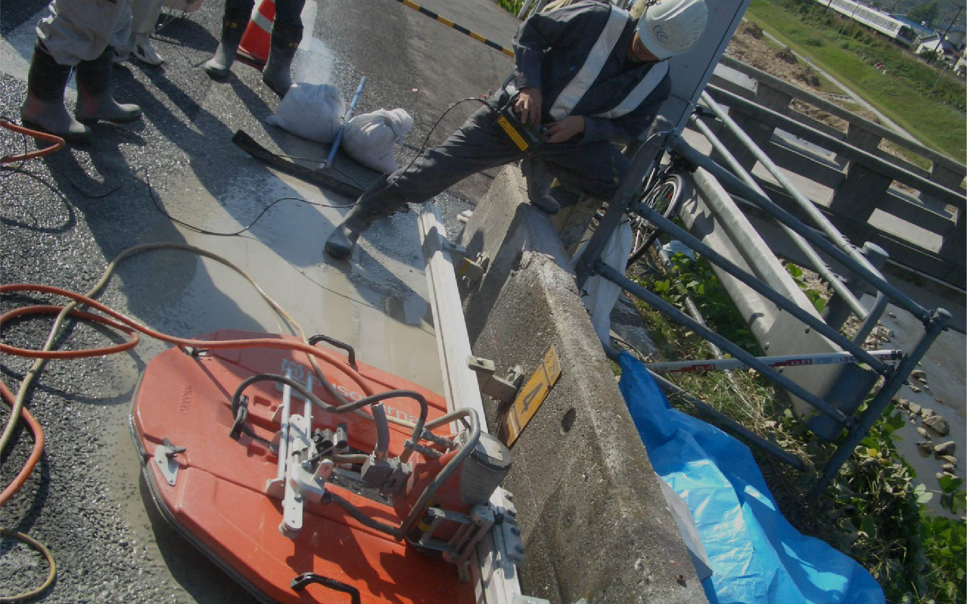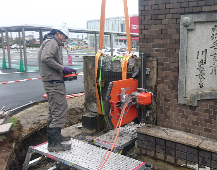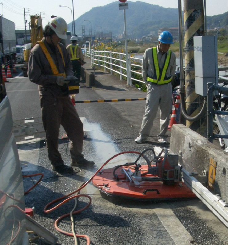 ハツリ⼯事と⽐較して、切断⾯の凹凸がなくきれいで、騒⾳、振動、粉塵が⾮常に少ない⼯法です。電動式と油圧式があり、排気ガスが発⽣しません。